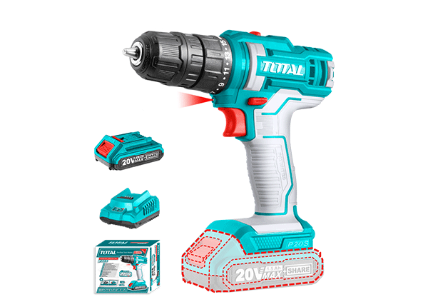 The TOTAL TDLI20051 is a versatile tool suitable for drilling metal or wood and fastening tasks. The drill-driver adheres to the P20S standard, allowing one battery to power over 100 tools.